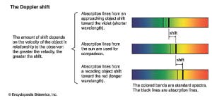 The following is an example of the Doppler effect: as one approaches a blowing horn, the perceived pitch is higher until the horn is reached and then becomes lower as the horn is passed. Similarly, the light from a star, observed from the Earth, shifts toward the red end of the spectrum (lower frequency or longer wavelength) if the Earth and star are receding from each other and toward the violet (higher frequency or shorter wavelength) if they are approaching each other. The Doppler effect is used in studying the motion of stars and to search …